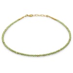 Perles de péridot, Ø 3,6 mm et anneaux décoratifs, argent 925 doré, montés sur câble d'acier. Fermoir en argent 925 doré. Longueur 40-43 cm. Poids 10 g.